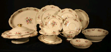 The set includes: 7 teacups, 8 bread and butter plates, 8 soup bowls, 4 salad plates, 8 fruit and dessert plates, 4 dinner plates, 1 oval serving bowl, 1 oval serving platter, and 1 gravy boat with attached under plate.