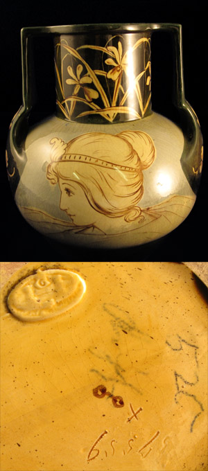 Jug shaped vase, hand painted with the image of a portrait and naturalistic flowers in relief. Unidentified makers mark. 9 1/2" high. Please note crazing and discoloration.