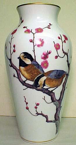 Vase measures 12" high and looks very much like a fine cloisonne piece. The design feature birds perched in blossoming trees. The porcelain ground is very fine and pure white. Vase is trimmed in gold on the rim and base.