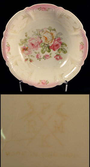 The bowl made in Germany; measures approximately 9 1/8" across x 2 1/2" high; and is in good condition with no chips or restoration. Acceptable minor surface wear to the decoration, as expected to find on a piece of this age. There is the faintest mark on the bottom of the bowl: appears to be the letters RPMK in between two crosses "arrows". Also a faint hairline crack on the bottom of the bowl that does not go through and does not show on the front of the bowl.