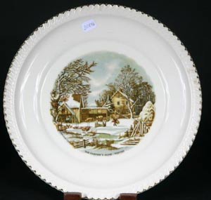 This large server has a crimped style curled rim, and a Currier and Ives Winter transfer print. It is in excellent/mint condition; there is crazing to inside and underside of plate, glaze skip on back.