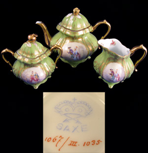 Teapot, cream pitcher and covered sugar decorated in floral sprays on one side, courting scene on the other. Ahrenfelt was a French Limoges company and also a New York City importer of fine porcelain.