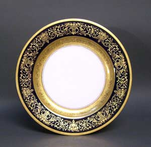 For the most elegant table display - this fine and impressive set of ten cobalt with raised gilt Hutschenreuther, Royal Bavarian dinner plates measure 10 7/8 inches, a great size. Each has rich thick, empasto and raised gold borders against elegant deep cobalt; a 1/2" border embellished with raised gold hand gilt decorations of fruits, scrolls, beaded swags and foliate surrounded by a raised gilt engraved outer band. The ground is pure white with an interior band decorated of gilt scrolls and a geometric pattern. A stunning set and even the undersides have gilding (sign of a fine plate!)