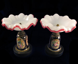 Marble plinth; a hand painted 'Old Paris' looking (possibly Sevres or Limoge) porcelain riser that supports a splendid antique French opaline ruffle-rimmed open tazza-style top; are a pair of mantel garnitures, which they probably were originally. Could be uses as as a pair of serving platters or even as stands for your big candles on a dinner table.