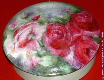 This is a delicious antique hand painted Jewelry Dresser Box or Lady's Powder Jar, completely hand-painted by an American china artist upon a vintage Bavarian porcelain mold. The Pink and Ruby Tea Roses are in the foreground, against a quite unusual and impressionistic background of suggestions of deep green foliage and lavender. This is a completely original, one-of-a-kind hand-painting by an independent American china painter upon a lady's classic dressing table mold. It's diminutive size also makes it the perfect piece for a guest table or nightstand display. This porcelain art treasure is a 'one and only' handmade work of art, not a mass produced factory item and, as such, is sure to become a precious family heirloom for its new owners for generations to come.