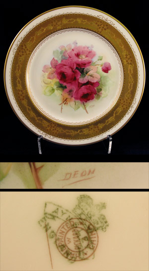 Antique hand painted English Aynsley Floral Art Plate, circa 1910, completely hand painted and signed by a superb American Edwardian Period china painter: DEON, who worked for the world famous W. A. PICKARD ART STUDIO in Chicago, Illinois during the very early 1900s. This outstanding work of vintage Art-Porcelain, with its sumptuous raised Coin Gold Paste border, has a clarity, simplicity and perfection to its artistry that will make it a crown jewel within any collection of antique hand painted roses.