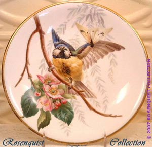 The diameter is 9-1/4" and the condition is excellent. It bears a red Royal Worcester under glaze factory mark on back, as well as a hand-lettered "V" indicating 1883. This British china plate or charger is made of soft paste porcelain, as opposed to the hard paste porcelains of Limoges, France. © 2007 Rosenquist Collection
